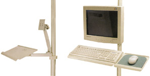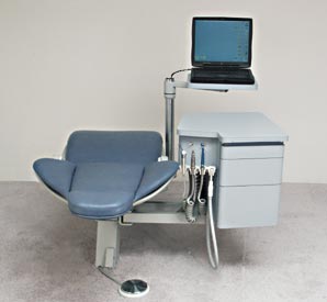 Notebook computers can be easily adapted to existing or new Dome equipment with an adjustable tray arm extending from a standard 2" post. Allows data retrieval from either side of the treatment chair without interfering with normal working surfaces. The notebook PC can be held in place with strips of double stick velcro attached to the tray and the underside of the notebook. Cables and power cord are partially concealed inside the 2" post. If there is a light at the top of the post, an oblong hole can be machined in the post below the arm to hide the cables as much as possible. Flat screen PC monitor and tray for a keyboard and mouse can be easily adapted to existing or new Dome equipment with a metal tray, two mounting brackets and an adaptor for a standard 2" post. The computer CPU is usually placed under the patient chair or in a nearby cabinet. The 2" post can be attached to the patient chair or to a delivery unit. Allows data retrieval from either side of the treatment chair without interfering with normal working surfaces. Cables and power cord are partially concealed inside the 2" post. If there is a light at the top of the post, a oblong hole can be machined in the post below the arm to hide the cables as much as possible. |